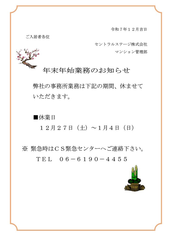 平素は弊社管理業務にご理解とご協力を賜り、誠に有り難うございます。